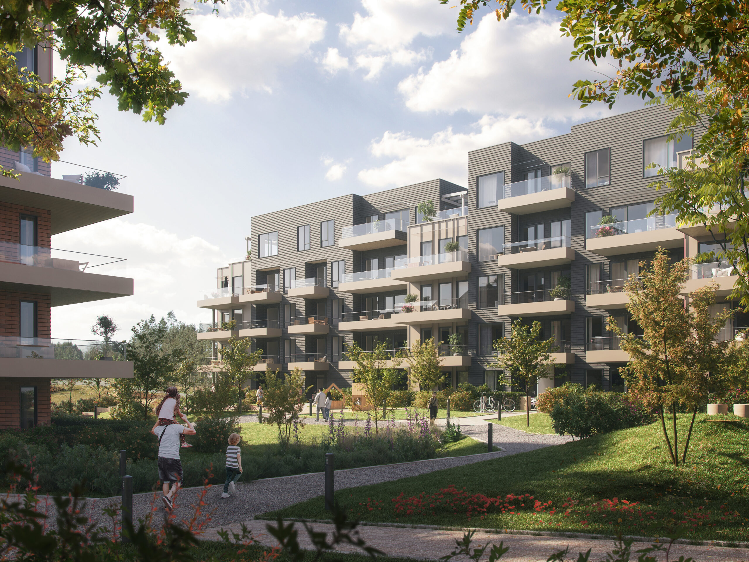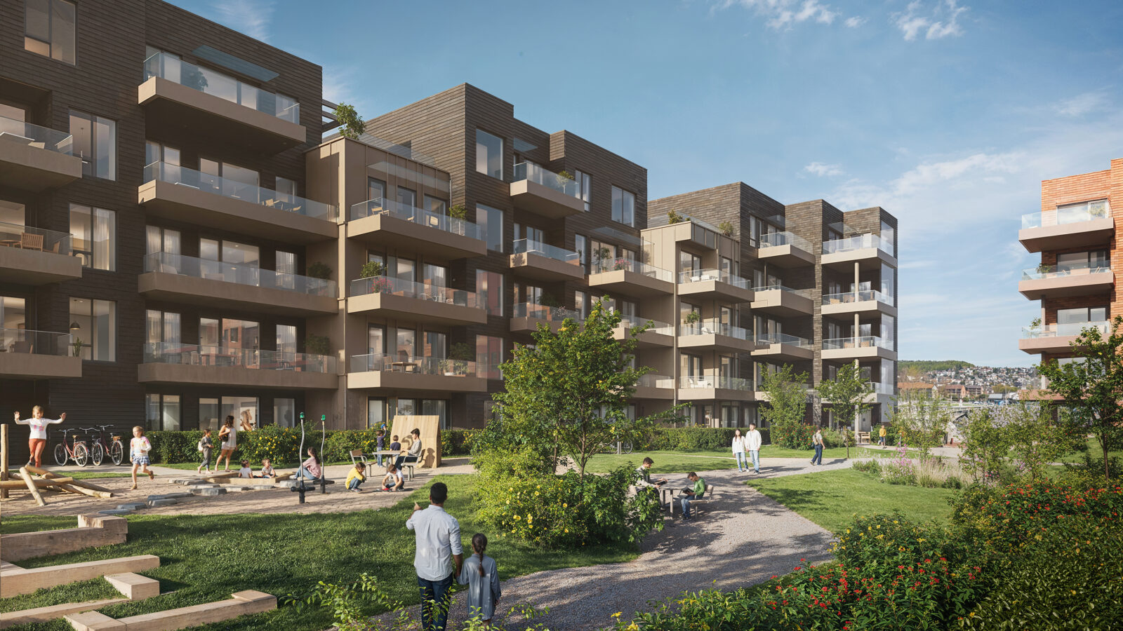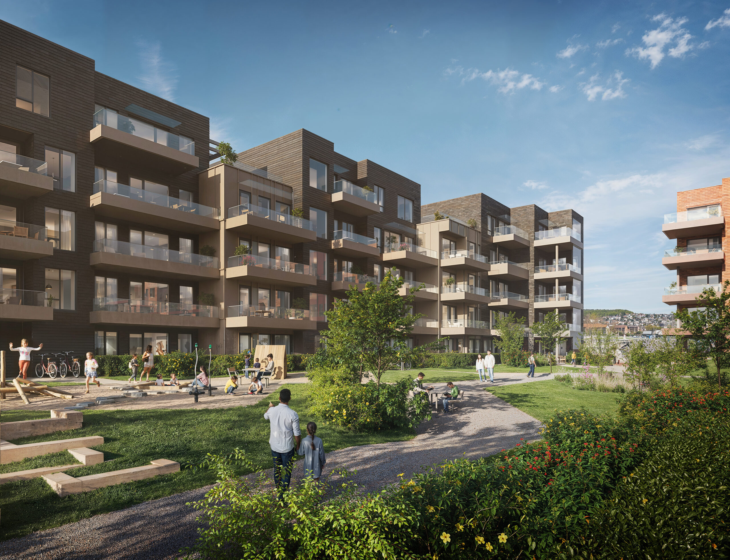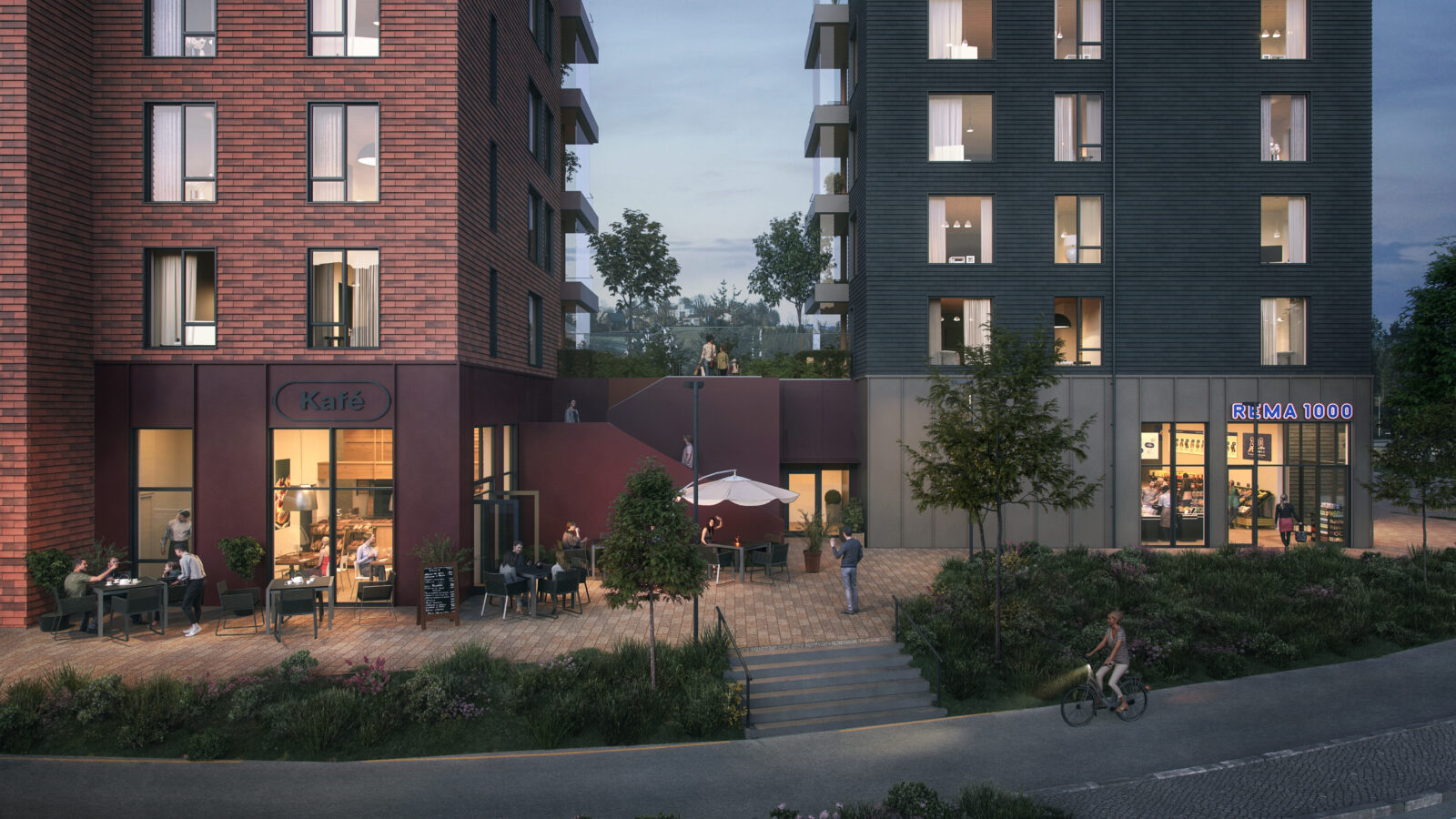 Prosjektet består av flere bygg som omkranser parklignende fellesarealer, der både fellesskap og privatliv er tenkt inn i detaljene. Mellom byggene finner du hyggelige møteplasser, grønne soner og lekeområder, og i underetasjen kommer både butikk og kafé – alt for å gjøre hverdagen enkel og sosial.