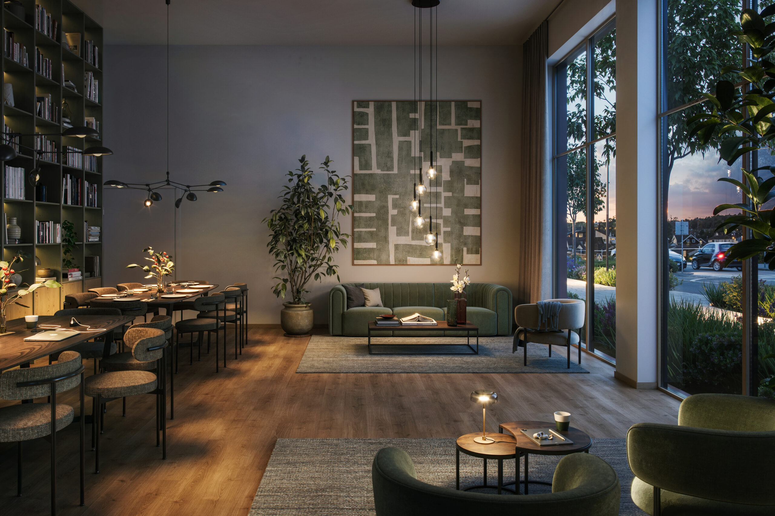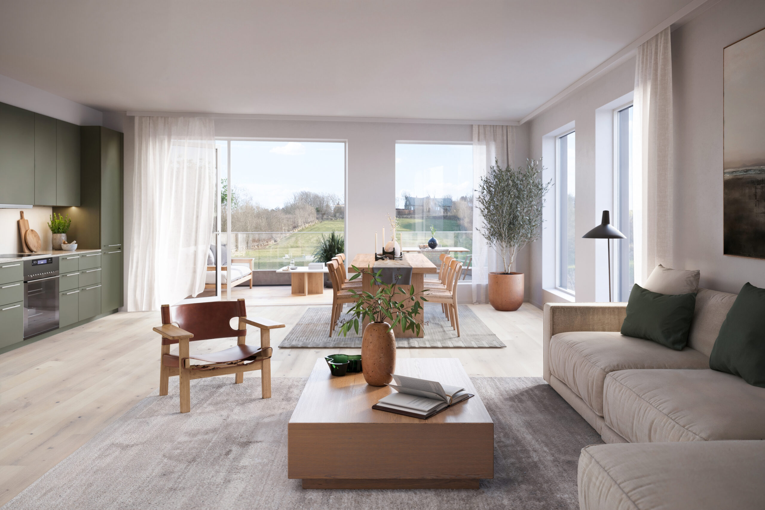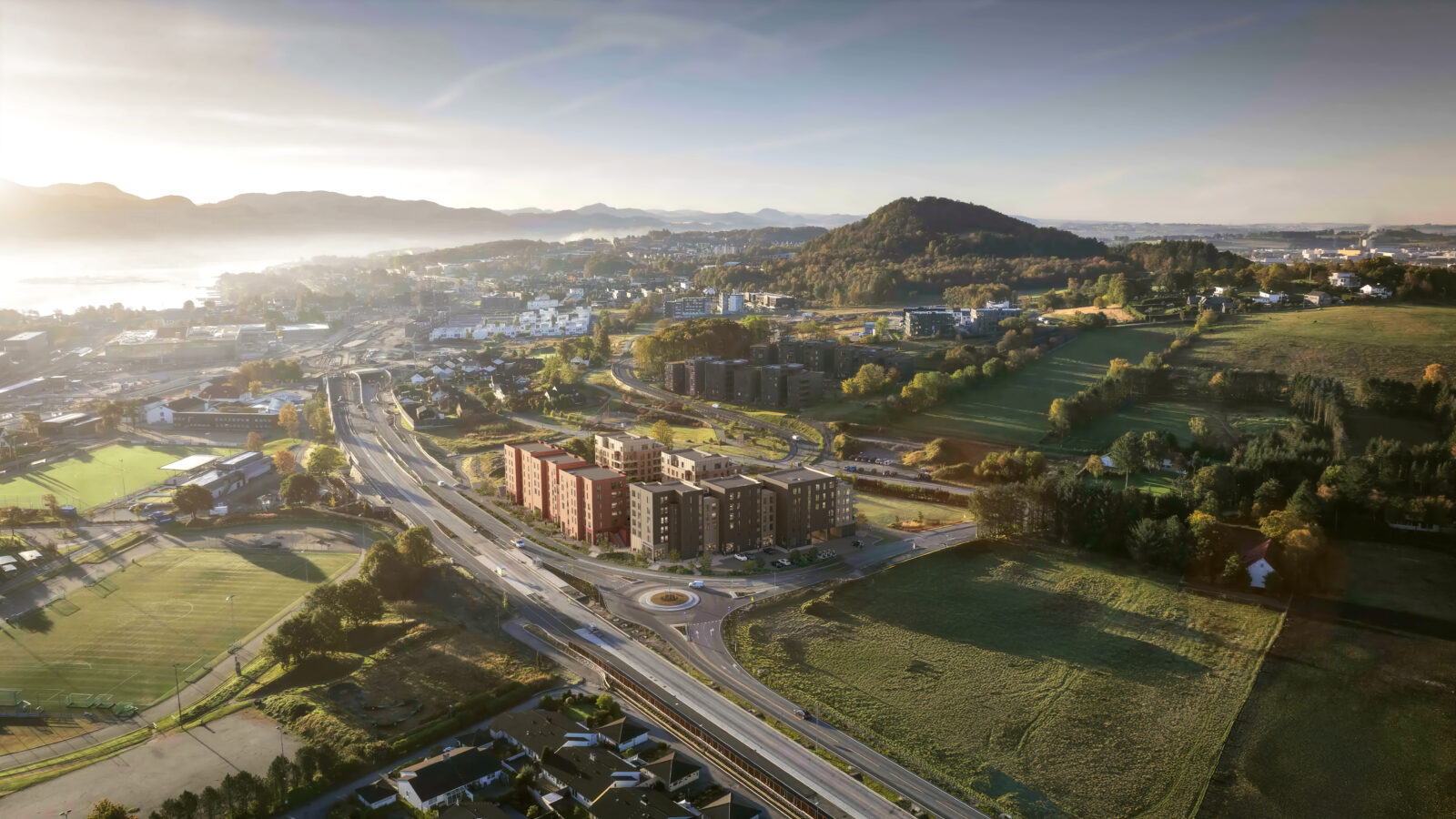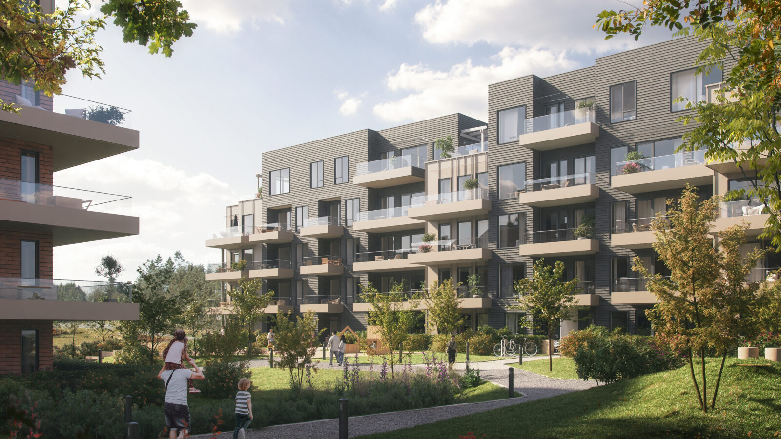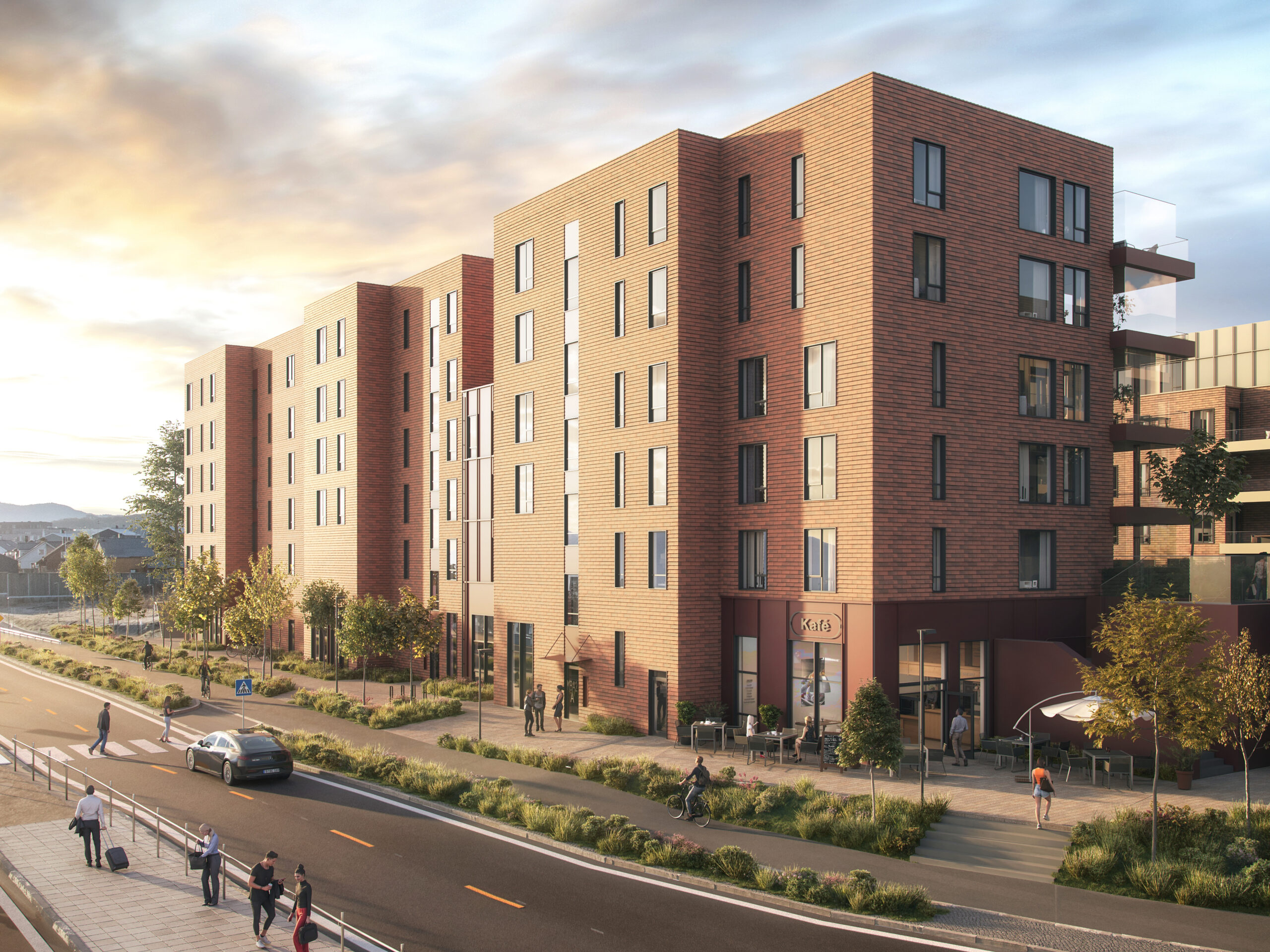 Prosjektet består av flere bygg som omkranser parklignende fellesarealer, der både fellesskap og privatliv er tenkt inn i detaljene. Mellom byggene finner du hyggelige møteplasser, grønne soner og lekeområder, og i underetasjen kommer både butikk og kafé – alt for å gjøre hverdagen enkel og sosial.
