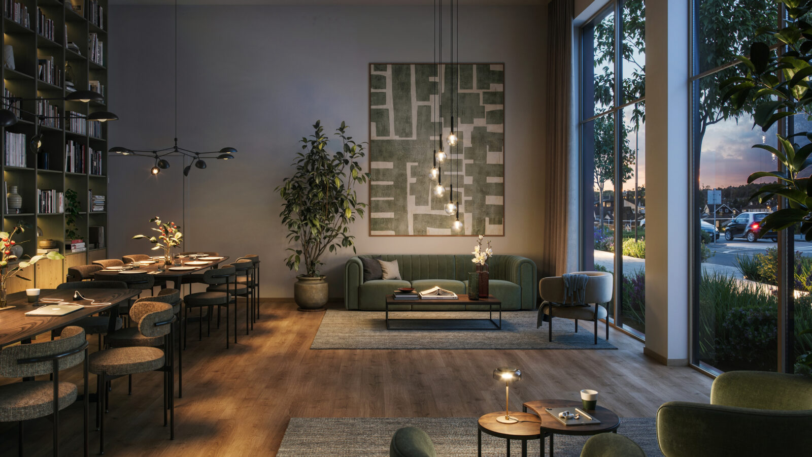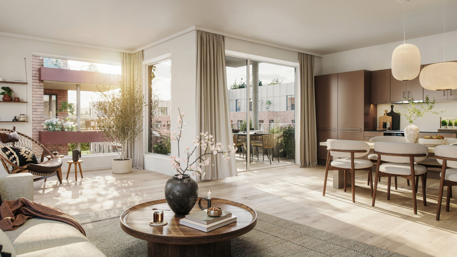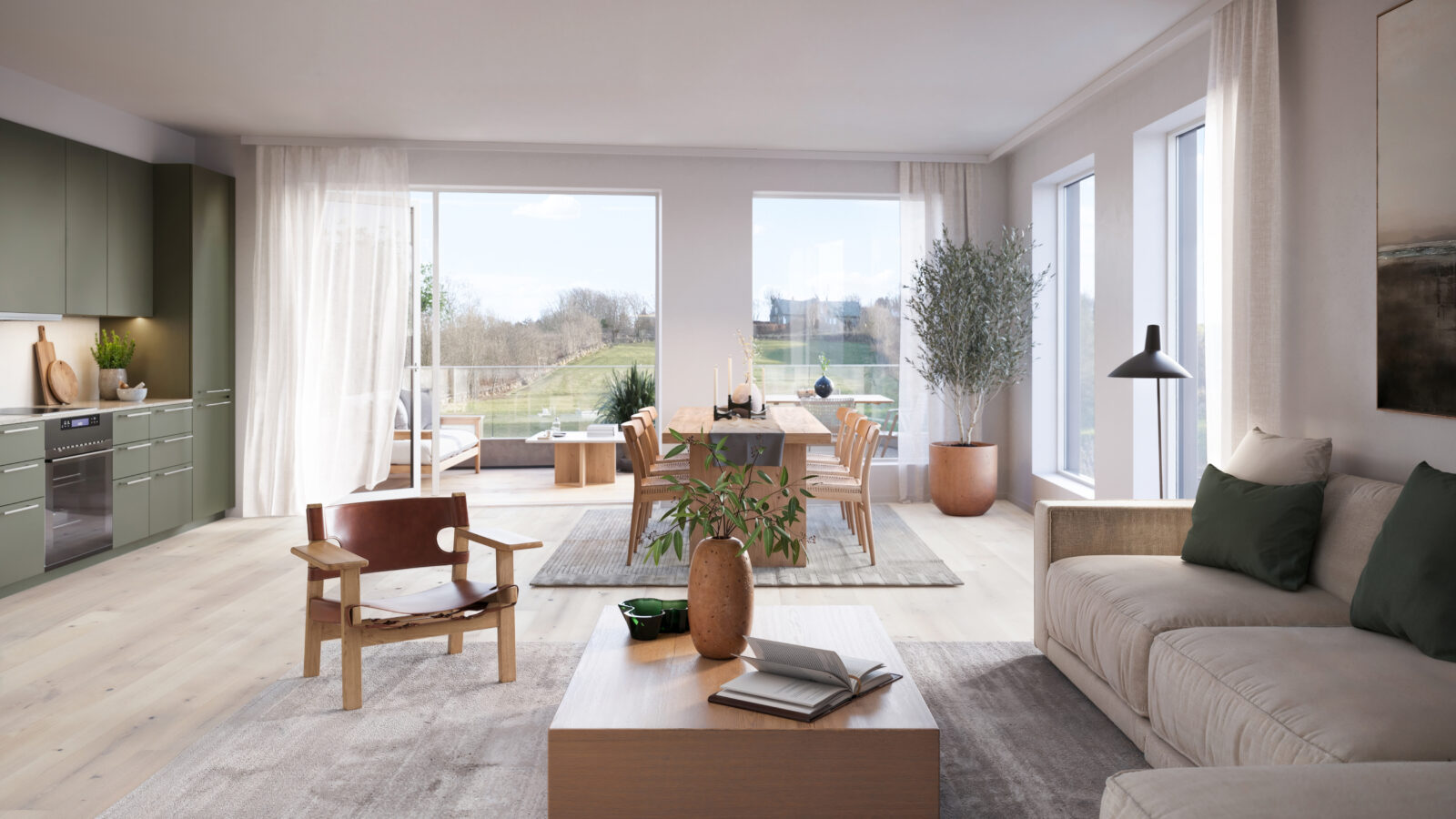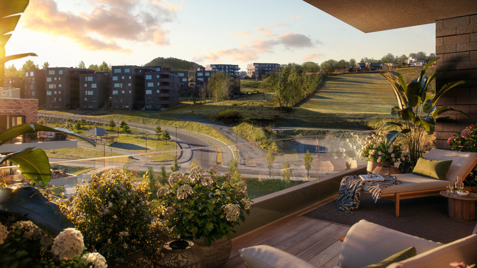 Prosjektet består av flere bygg som omkranser parklignende fellesarealer, der både fellesskap og privatliv er tenkt inn i detaljene. Mellom byggene finner du hyggelige møteplasser, grønne soner og lekeområder, og i underetasjen kommer både butikk og kafé – alt for å gjøre hverdagen enkel og sosial.
