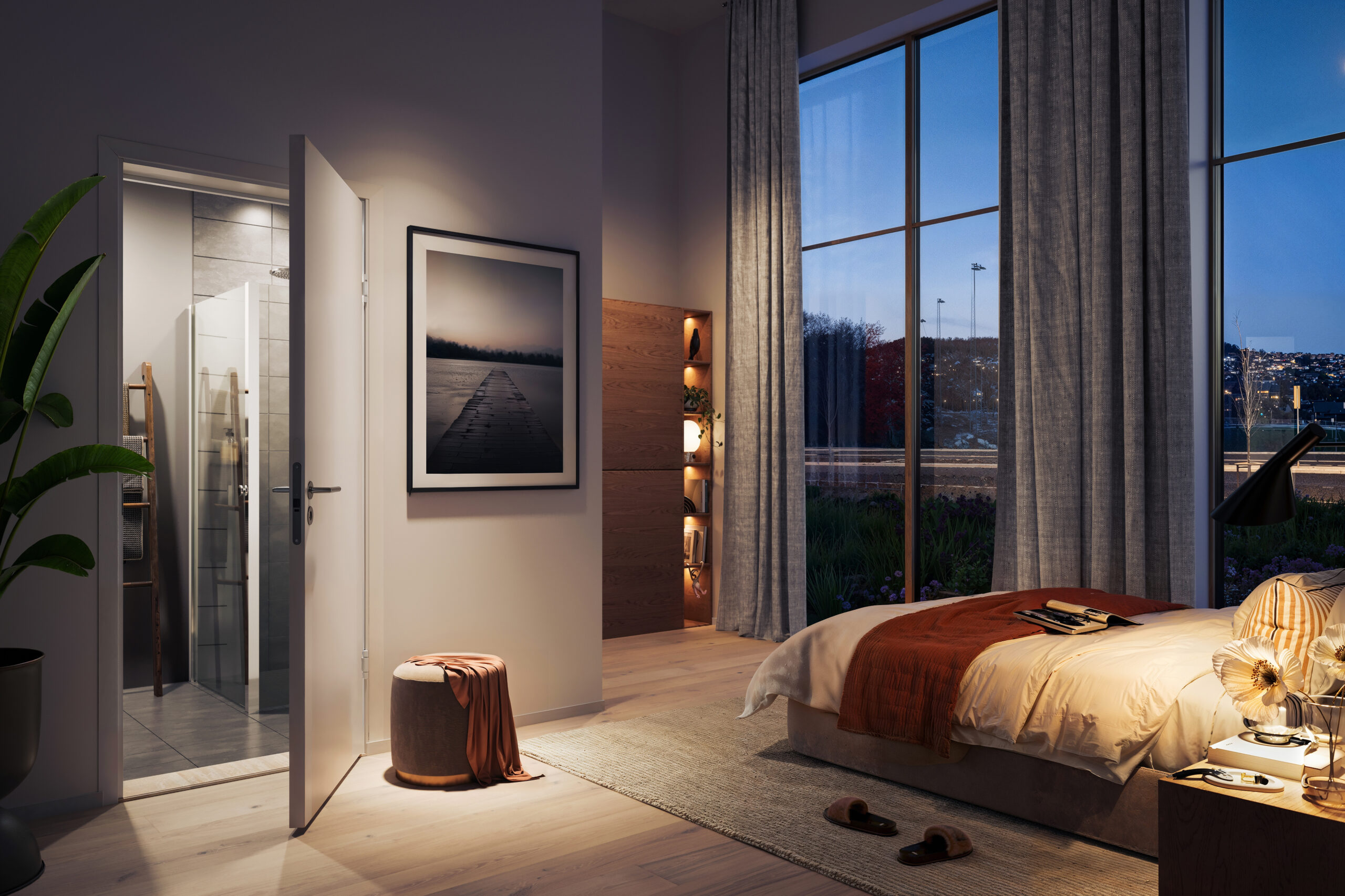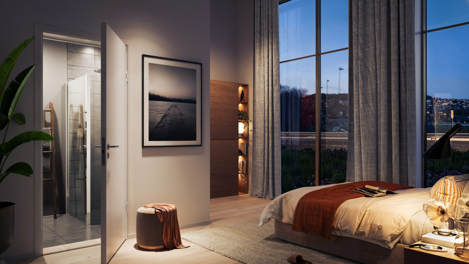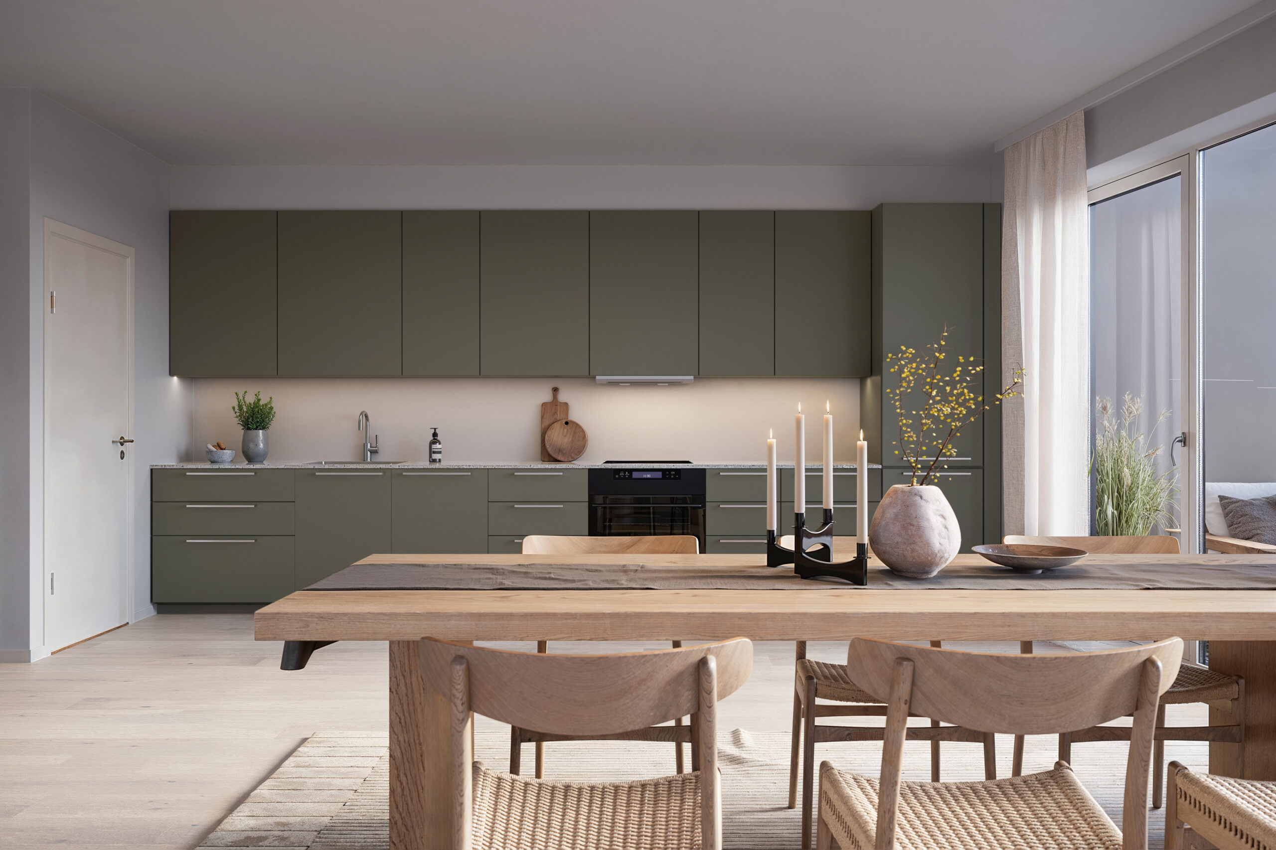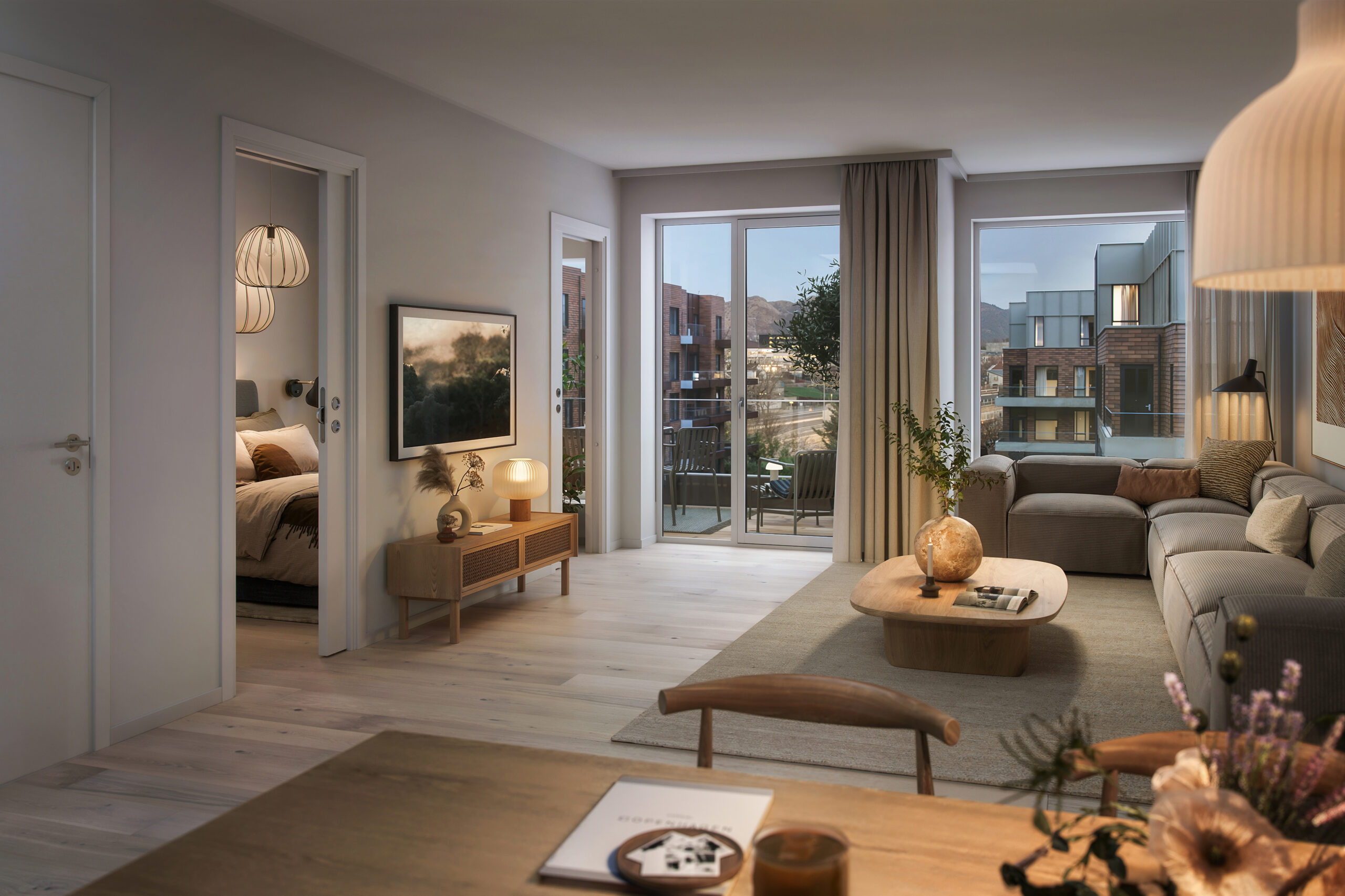 Her kommer ca. 131 leiligheter med størrelser fra 42 til 105 m² i første byggetrinn, alle med gjennomtenkte planløsninger, god takhøyde og tilknytning til flotte, grønne uteområder.